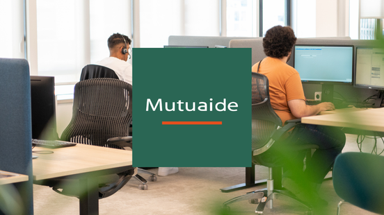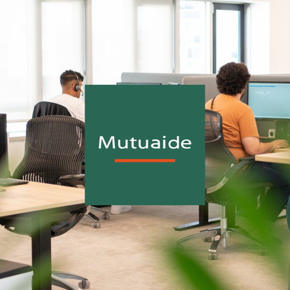 Bureau ouvert chez Mutuaide avec agents au travail sur ordinateurs et logo Mutuaide affiché sur moniteurs et panneaux.